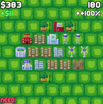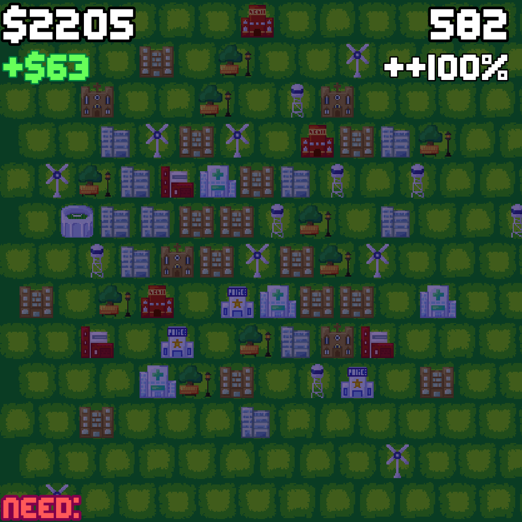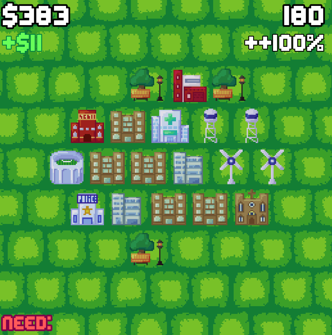 this is my 2nd game jam so I hope you guys like it! it's a city builder but you have very little space to build buildings, the game does not have a main objective, but you can try to reach the biggest amount of population, my personal best is 2425, good luck! :>